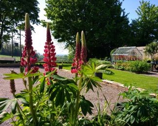 Brambles Bed and Breakfast has a large south-facing garden with views towards Tiverton and the Exe Valley, the Blackdown Hills and Culm Valley. Heavily planted borders, with hundreds of hardy perennials, azaleas, camellia, ferns, flowering quince, forsythia, fuchsias, lilac, magnolias, pieris, rhododendrons, roses, skimmia and viburnum. Terraced with seating areas, lawns, paths, patios, hedges, green houses, sheds, plant tables and pots, the garden provides a welcoming and tranquil environment for guests to appreciate. There are often plants for sale and free to take away.
